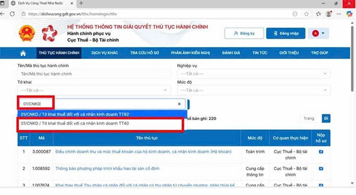 NNT vào tab Thủ tục hành chính, tại "Tờ khai", nhập tìm kiếm "01/CNKD"