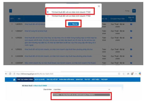 → Hiện ra 2 lựa chọn, NNT lựa chọn mẫu 01/CNKD theo TT40