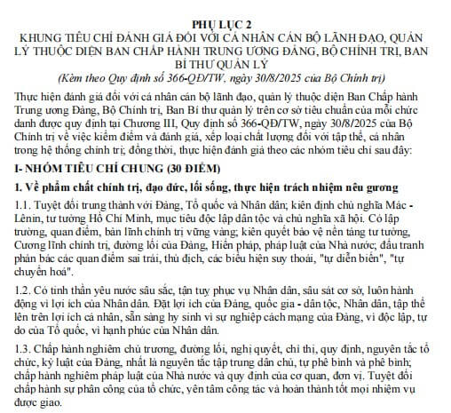 Khung tiêu chí đánh giá đối với cá nhân giữ chức vụ lãnh đạo, quản lý thuộc diện Ban Chấp hành Trung ương Đảng, Bộ Chính trị, Ban Bí thư quản lý theo Quy định 366-QĐ/TW là cơ sở quan trọng nhằm bảo đảm công tác nhận xét, đánh giá cán bộ được thực hiện một cách khoa học, khách quan và phù hợp với yêu cầu nhiệm vụ trong giai đoạn mới.