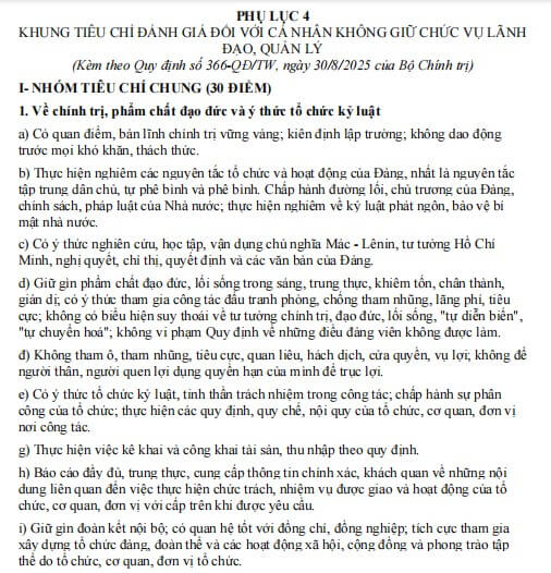 Khung tiêu chí đánh giá đối với cá nhân không giữ chức vụ lãnh đạo, quản lý theo Quy định 366-QĐ/TW là căn cứ quan trọng nhằm bảo đảm việc nhận xét, đánh giá cán bộ, đảng viên được thực hiện khách quan, công bằng và thống nhất.