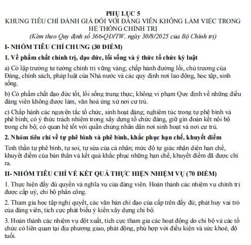 Khung tiêu chí đánh giá đối với đảng viên không làm việc trong hệ thống chính trị theo Quy định 366-QĐ/TW là văn bản quan trọng, được ban hành nhằm bảo đảm việc đánh giá, phân loại đảng viên được thực hiện một cách khách quan, minh bạch và phù hợp với thực tiễn. Quy định này đưa ra các tiêu chí cụ thể để xem xét mức độ rèn luyện, phẩm chất chính trị, đạo đức, lối sống, ý thức chấp hành chủ trương, chính sách của Đảng và pháp luật của Nhà nước, cũng như kết quả thực hiện nhiệm vụ tại cơ quan, đơn vị hoặc trong đời sống xã hội.
