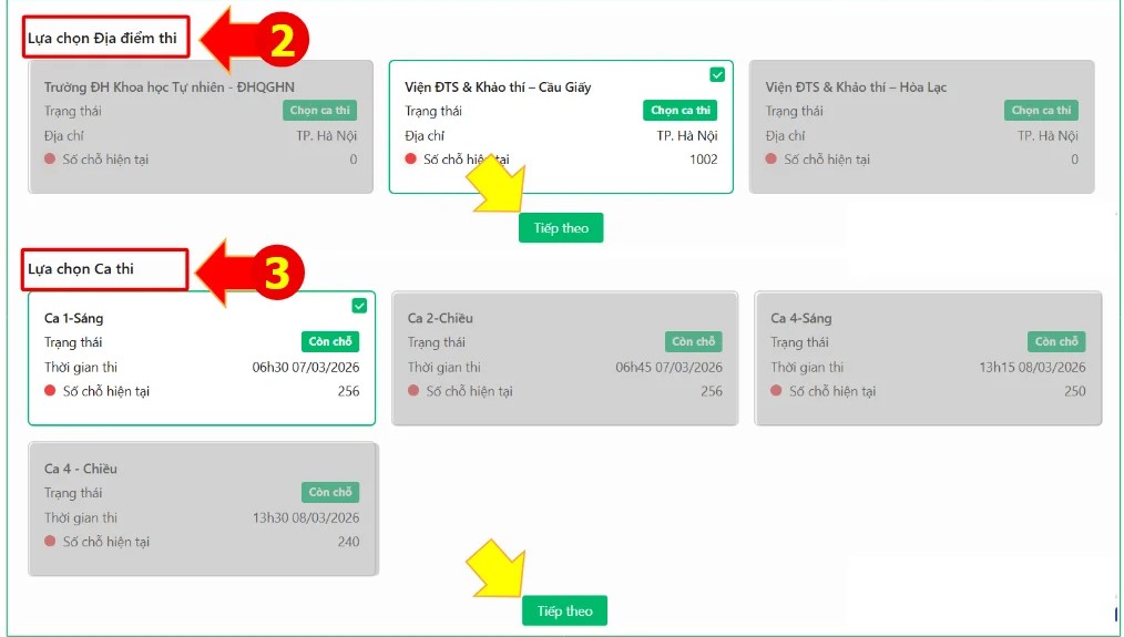 Lần lượt chọn "Kỳ thi", "Đợt thi", "Địa điểm thi", "Ca thi". Thí sinh được chọn 2 ca thi/năm; thời gian giữa 2 ca thi (gồm cả ngày thi) cách nhau tối thiểu 28 ngày. Các ca thi đã đủ số lượng thí sinh đăng ký (hết chỗ) sẽ ở dạng không hoạt động và có thông báo "Hết chỗ"
