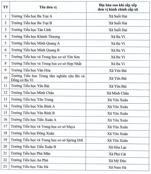 - Nhóm 1: Đối với học sinh tiểu học đang theo học tại 23 cơ sở giáo dục (thuộc địa bàn các xã miền núi và các xã bãi giữa sông Hồng thời điểm trước sắp xếp đơn vị hành chính cấp xã) được quy định tại bảng sau đây thì mức hỗ trợ là 30.000 đồng/học sinh/ngày: