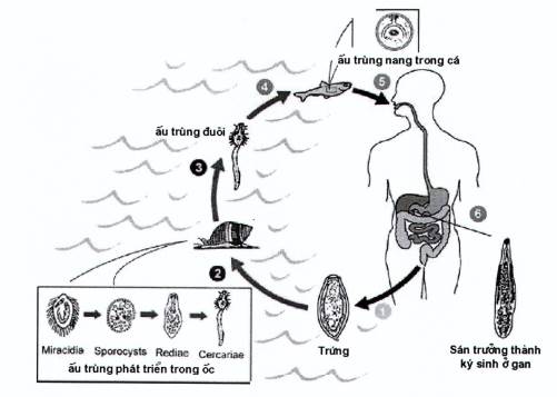 (4) Giai đoạn ở cá: Ấu trùng đuôi xâm nhập vào cá nước ngọt, rụng đuôi phát triển thành ấu trùng nang ký sinh trong cá (metacercariae).