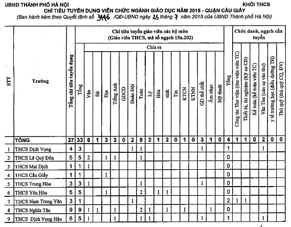Chỉ tiêu tuyển dụng viên chức ngành giáo dục quận Cầu Giấy năm 2015 - Khối THCS