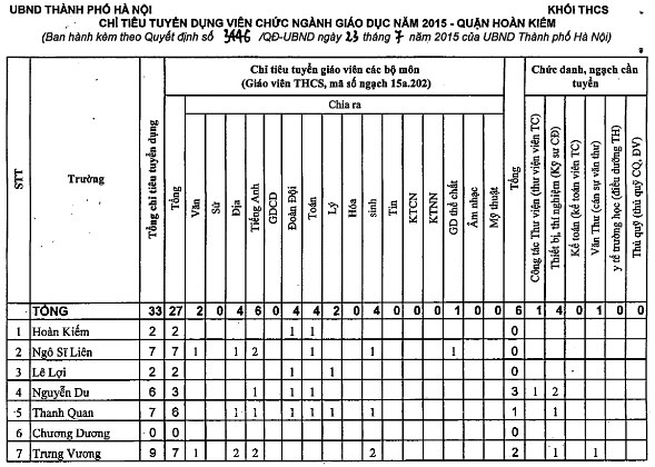 Chỉ tiêu tuyển dụng viên chức ngành giáo dục quận Hoàn Kiếm năm 2015 - Khối THCS