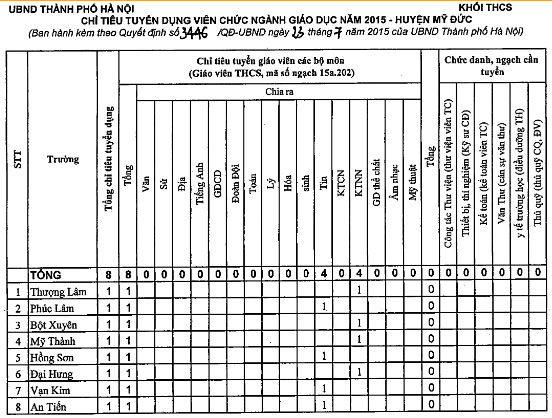 Chỉ tiêu tuyển dụng viên chức ngành giáo dục huyện Mỹ Đức năm 2015 - Khối THCS