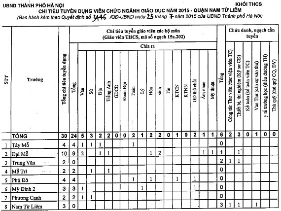 Chỉ tiêu tuyển dụng viên chức ngành giáo dục quận Nam Từ Liêm năm 2015 - Khối THCS