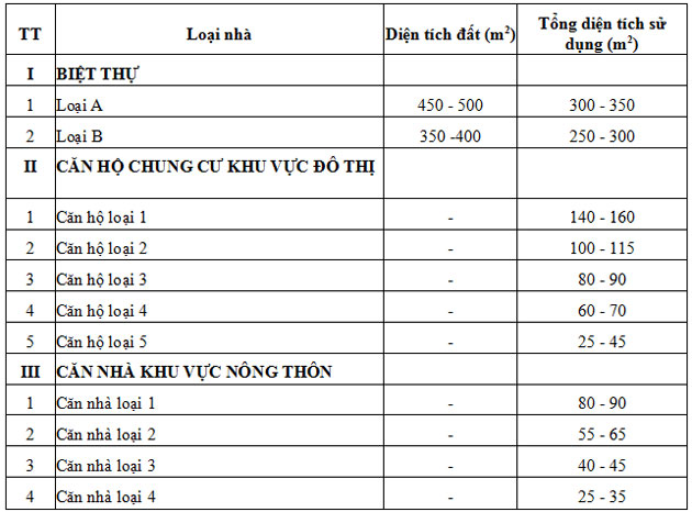 Được thiết kế căn nhà kiểu khép kín, diện tích sử dụng mỗi căn nhà không nhỏ hơn 25 m2 và không lớn hơn 90 m2.