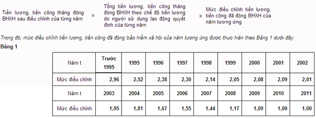 1. Tiền lương, tiền công tháng đã đóng bảo hiểm xã hội đối với đối tượng quy định tại khoản 1 Điều 1 Thông tư này được điều chỉnh theo công thức sau: