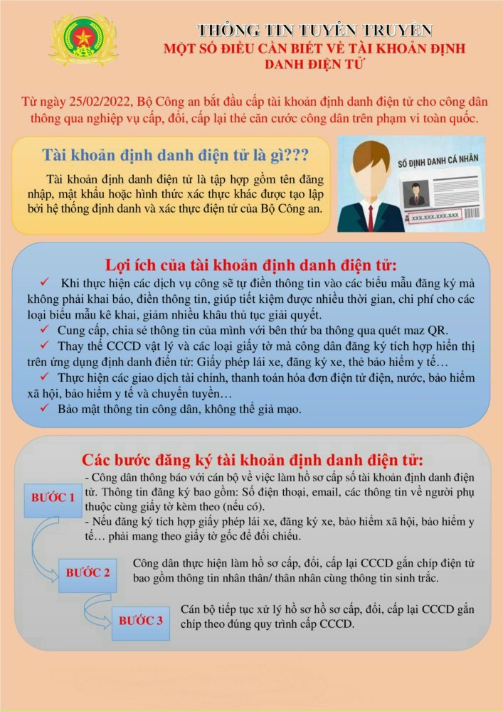 Tài khoản định danh điện tử là tài khoản chứa các thông tin cá nhân của công dân, được quản lý và xác thực trên ứng dụng định danh điện tử quốc gia VNeID, do Bộ Công an phát triển. Đối với những công dân đã được cấp thẻ căn cước gắn chip thì có thể tiến hành thực hiện đăng kí tài khoản định danh điện tử mức độ 1 qua ứng dụng VNelD. Đối với tài khoản định danh điện tử mức độ 2, người dân đến Công an xã, phường, thị trấn hoặc nơi làm thủ tục cấp thẻ Căn cước công dân để làm thủ tục cấp tài khoản định danh điện tử.
