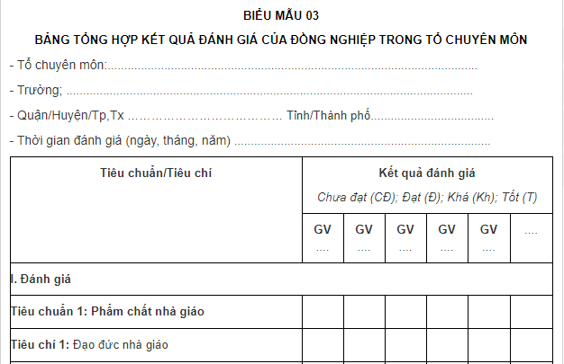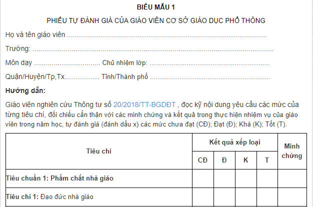 Tổng hợp biểu mẫu đánh giá chuẩn giáo viên 2025