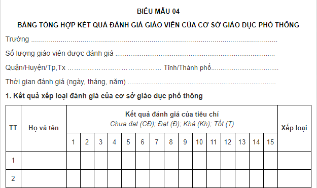 4. Bảng tổng hợp kết quả đánh giá giáo viên của cơ sở giáo dục phổ thông
