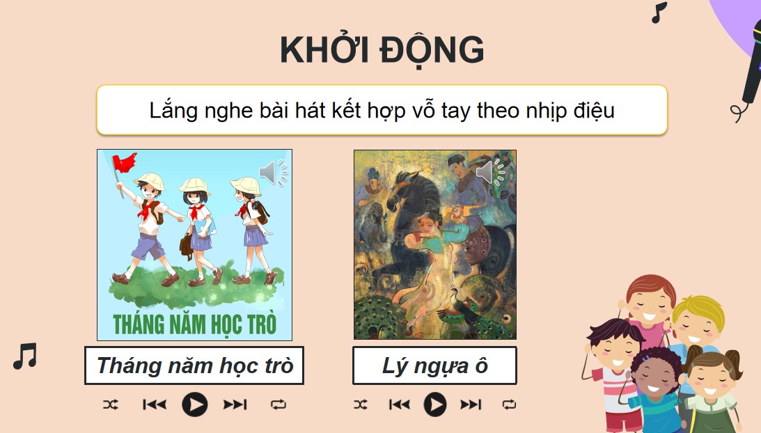 - Cảm nhận giai điệu, nội dung, sắc thái của 4 bài hát Nối vòng tay lớn, Bảy sắc cầu vồng, Tháng năm học trò, Lí ngựa ô với các hình thức biểu diễn khác nhau.