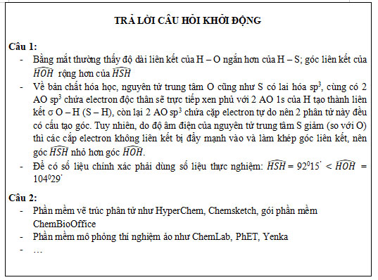 - Vận dụng kiến thức, kĩ năng đã học: Sử dụng được kết quả tính toán để thấy được hình học phân tử, xu hướng thay đổi độ dài, góc liên kết và năng lượng phân tử trong dãy các chất (cùng nhóm, chu kì, dãy đồng đẳng,..).