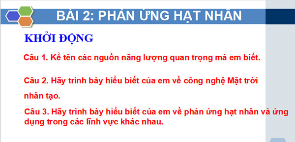 Câu 3: Phản ứng hạt nhân là một quá trình biến đổi hạt nhân nguyên tử dẫn đến sự biến đổi chúng thành các hạt khác.
