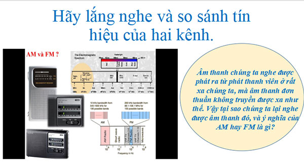 GV trình chiếu hình ảnh, đồng thời mang máy thu thanh cho 1 HS lên điều chỉnh để nghe đài với các tần số khác nhau. Gồm FM 100 MHz và AM 100 MHz.