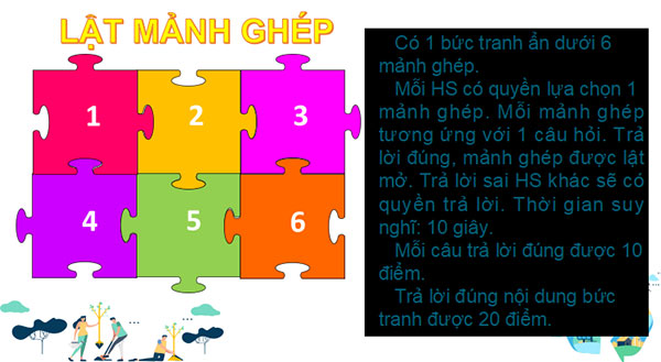 ● Mỗi nhóm có quyền lựa chọn 1 mảnh ghép. Mỗi mảnh ghép tương ứng với 1 câu hỏi. Trả lời đúng, mảnh ghép được lật mở. Trả lời sai nhóm khác sẽ có quyền trả lời. Thời gian suy nghĩ: 10 giây.