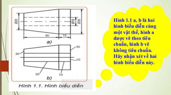 Hình 1.1 a, b là hai hình biểu diễn cùng một vật thể, hình a được vẽ theo tiêu chuẩn, hình b vẽ không tiêu chuẩn. Hãy nhận xét về hai hình biểu diễn này.