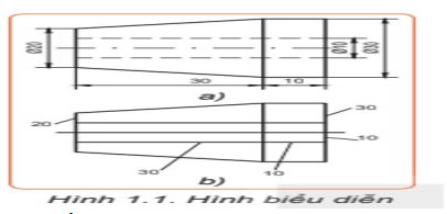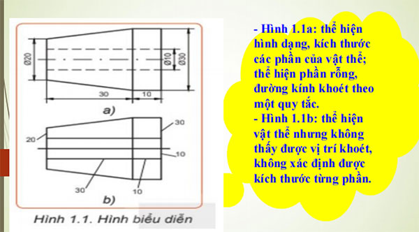 - Hình 1.1a: thể hiện hình dạng, kích thước các phần của vật thể; thể hiện phần rỗng, đường kính khoét theo một quy tắc.
