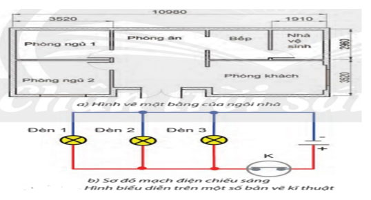 - Hình b trình bày sơ đồ mạch điện chiếu sáng có 3 bóng đèn, khóa điện, nguồn điện.