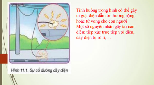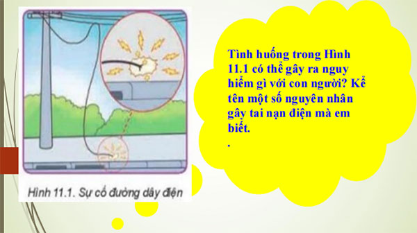 Tình huống trong Hình 11.1 có thể gây ra nguy hiểm gì với con người? Kể tên một số nguyên nhân gây tai nạn điện mà em biết.