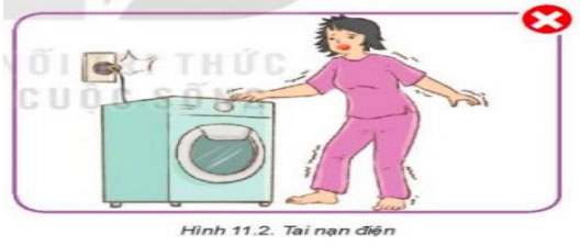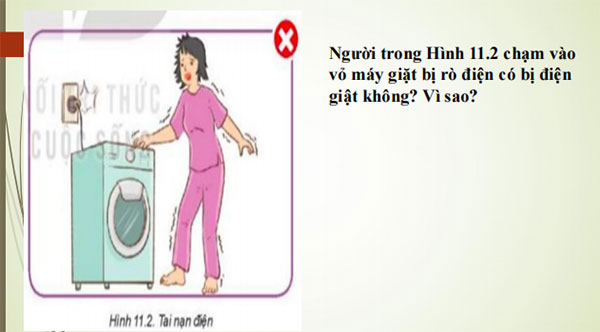 Người trong Hình 11.2 chạm vào vỏ máy giặt bị rò điện có bị điện giật không? Vì sao?