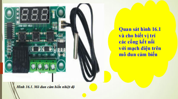 Quan sát hình 16.1 và cho biết vị trí các cổng kết nối với mạch điện trên mô đun cảm biến