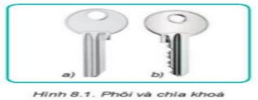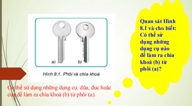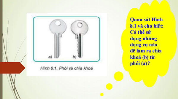 Quan sát Hình 8.1 và cho biết: Có thể sử dụng những dụng cụ nào để làm ra chìa khoá (b) từ phôi (a)?