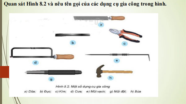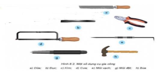 Quan sát Hình 8.2 và nêu tên gọi của các dụng cụ gia công trong hình.