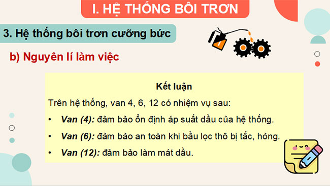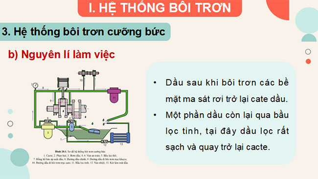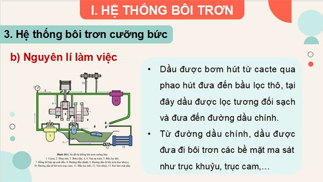 - Mô tả được cấu tạo, giải thích được nguyên lí làm việc của hệ thống bôi trơn.