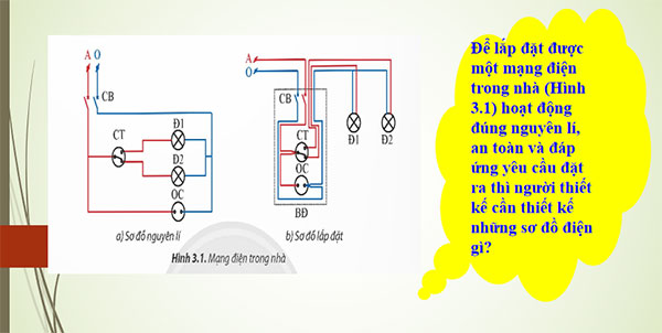 - GV dẫn dắt và đặt câu hỏi: Để lắp đặt được một mạng điện trong nhà (Hình 3.1) hoạt động đứng nguyên lí, an toàn và đáp ứng yêu cầu đặt ra thì người kế cần thiết kế những sơ đồ điện gì?