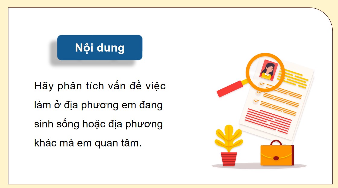 - Năng lực nhận thức khoa học địa lí: Thu thập được các thông tin về vấn đề việc làm ở địa phương em đang sinh sống hoặc địa phương khác mà em quan tâm.