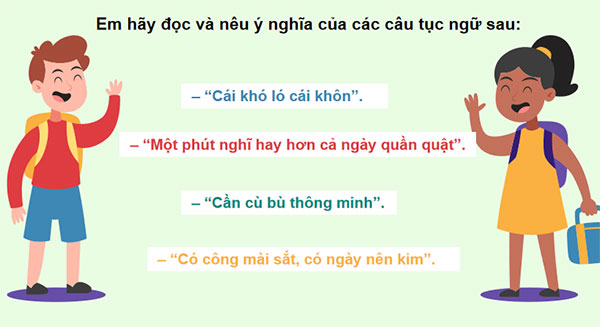 c. Sản phẩm: Câu trả lời của học sinh. Một số câu ca dao, tục ngữ, thành ngữ nói về sự cần cù, sáng tạo trong lao động: + “Cần cù bù thông minh” + “Cái khó ló cái khôn” + “Một phút nghĩ hay hơn cả ngày quần quật” + “Chịu khó mới có mà ăn”. + “Muốn ăn thì phải chăm làm/ Một hạt thóc vàng, chín hạt mồ hôi”. + “Rủ nhau đi cấy đi cày/ Bây giờ khó nhọc, có ngày phong lưu”. + “Có làm thì mới có ăn/ Không dưng ai dễ đem phần đến cho”. d. Tổ chức thực hiện: |