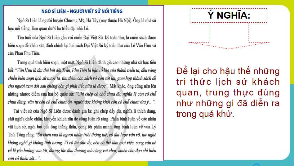 - GV cho HS xem hình ảnh và thông tin ngắn gọn về một số nhân vật tiêu biểu thể hiện tính khách quan, công bằng trong lịch sử và yêu cẩu HS nêu thêm những hiểu biết của bản thân về những nhân vật đó. Ví dụ: nhà sử học Ngô Sĩ Liên (tiêu biểu cho tính khách quan, trung thực trong viết sử); vua Lý Thái Tông (ngành Toà án chọn là nhân vật lịch sử tiêu biểu cho công lí và hoạt động xét xử).