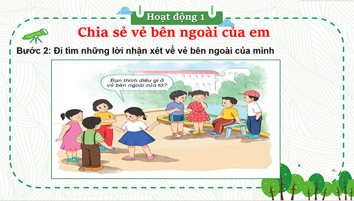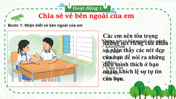• Biết nhận xét, đánh giá vẻ ngoài của bản thân và của người khác theo hướng tích cực, từ đó giáo dục lòng nhân ái cho HS.