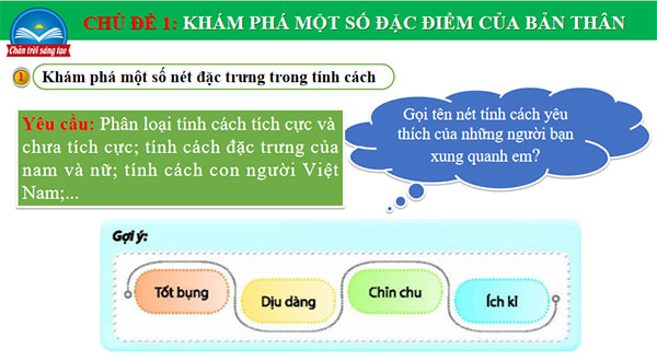 - GV giới thiệu ý nghĩa của giai đoạn lứa tuổi đối với việc hình thành tích cách, sự cần thiết cũng như hấp dẫn của chủ đề và một số tính cách sẽ được khám phá.