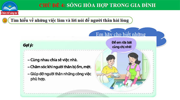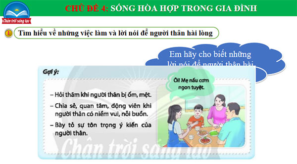 - GV giới thiệu ý nghĩa, sự cần thiết của chủ đề, giới thiệu khái quát về cách sống hoà hợp trong gia đình: thực hiện được những việc làm và lời nói để người thân hài lòng, thể hiện sự tôn trọng ý kiến khác nhau của các thành viên trong gia đình và thể hiện được khả năng thuyết phục, sắp xếp công việc và hoàn thành các công việc trong gia đình.