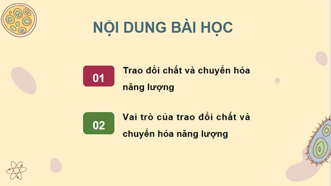 - Nêu được vai trò của trao đổi chất và chuyển hoá năng lượng trong cơ thể.