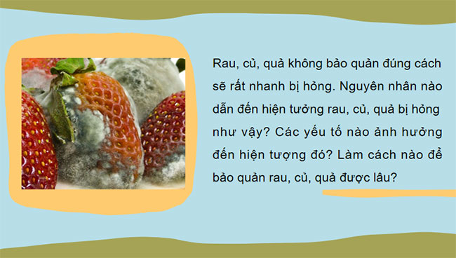 *Chuyển giao nhiệm vụ học tập - Chiếu hình ảnh về rau, củ, quả bảo quản không đúng cách. - GV đưa ra vấn đề cho học sinh: Nguyên nhân nào dẫn đến hiện tượng rau, củ, quả bị hỏng như vậy? Các yếu tố nào ảnh hưởng đến hiện tượng đó? Làm cách nào để bảo quản rau, củ, quả được lâu? *Thực hiện nhiệm vụ học tập - HS hoạt động cá nhân theo yêu cầu của GV. - Giáo viên: Theo dõi và bổ sung khi cần. *Báo cáo kết quả và thảo luận - GV gọi ngẫu nhiên học sinh trình bày đáp án, những HS khác tham gia nhận xét và phản biện từ đó tạo ra được mâu thuẫn của vấn đề *Đánh giá kết quả thực hiện nhiệm vụ - Học sinh nhận xét, bổ sung, đánh giá: - Giáo viên nhận xét, đánh giá: ->Giáo viên gieo vấn đề cần tìm hiểu trong bài học để trả lời câu hỏi trên đầy đủ và chính xác nhất chúng ta vào bài học hôm nay. ->Giáo viên nêu mục tiêu bài học: |