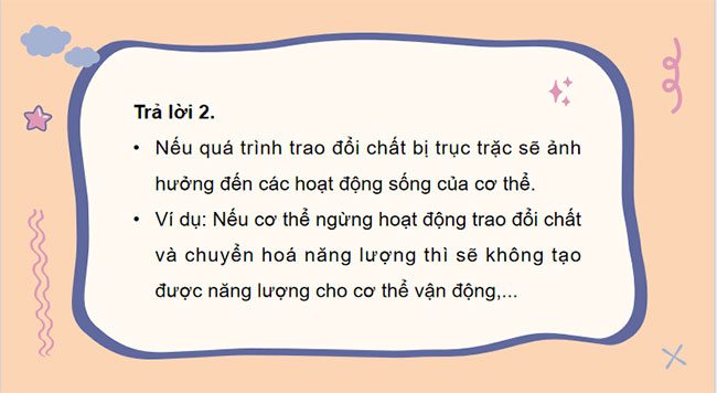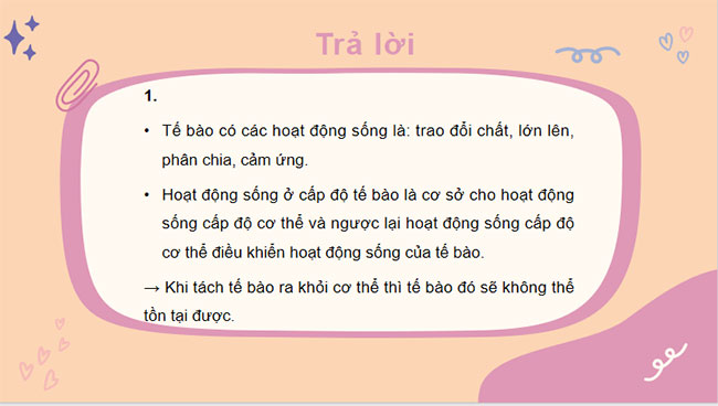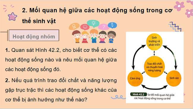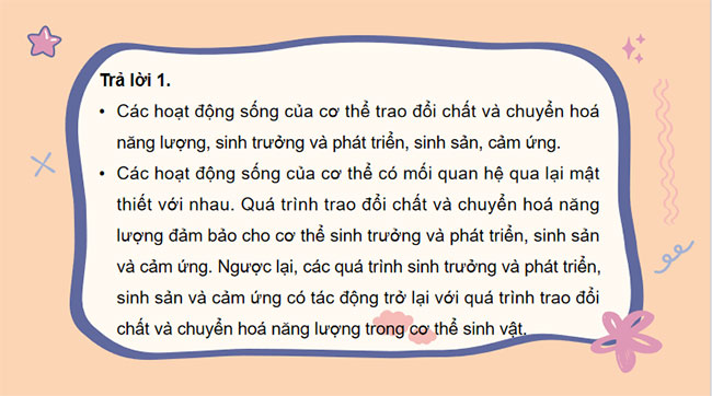 - Năng lực giao tiếp và hợp tác: thảo luận nhóm để tìm ra mối quan hệ giữa tế bào, cơ thể và môi trường, mối quan hệ giữa các hoạt động sống trong cơ thể sinh vật.