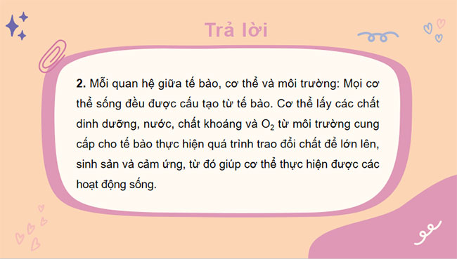 - Năng lực tìm hiểu tự nhiên: Nêu được mối quan hệ giữa tế bào, cơ thể và môi trường, mối quan hệ giữa các hoạt động sống trong cơ thể sinh vật.