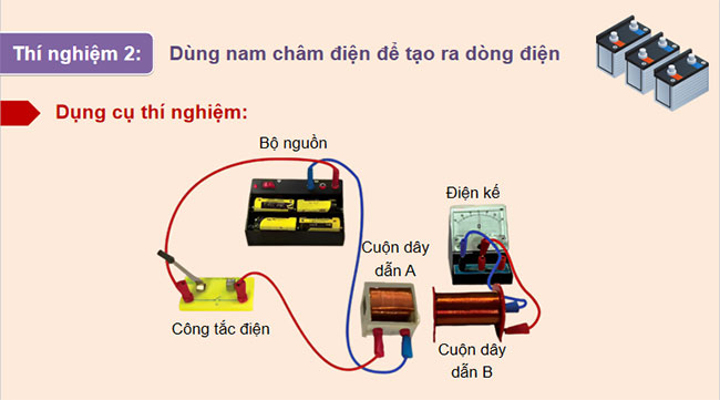 + 6 bộ (2) gồm: hai cuộn dây dẫn A và B, điện kế (có vạch 0 nằm ở giữa thang đo), bộ nguồn gồm 4 viên pin 1,5 V, đế gắn pin có công tắc và đèn tín hiệu, công tắc điện và các dây nối.