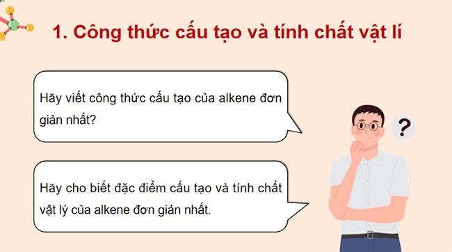 - Năng lực tự chủ và tự học: Chủ động, tích cực tìm hiểu về khái niệm về alkene; Trình bày được công thức phân tử, công thức cấu tạo và ứng dụng của một số alkene đơn giản.