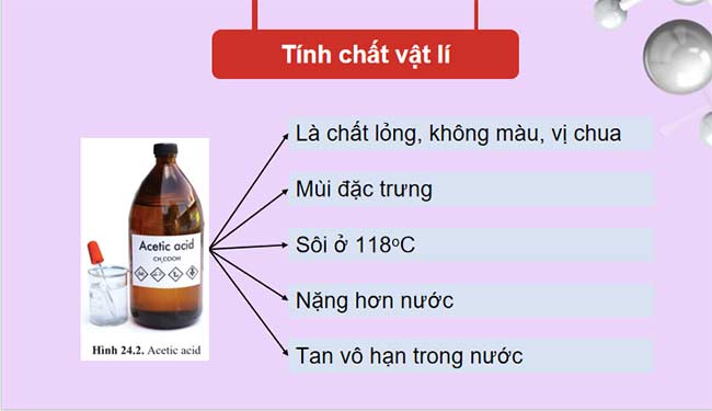 – Quan sát mẫu vật hoặc hình ảnh, trình bày được một số tính chất vật lí của acetic acid: trạng thái, màu sắc, mùi vị, tính tan, khối lượng riêng, nhiệt độ sôi.
