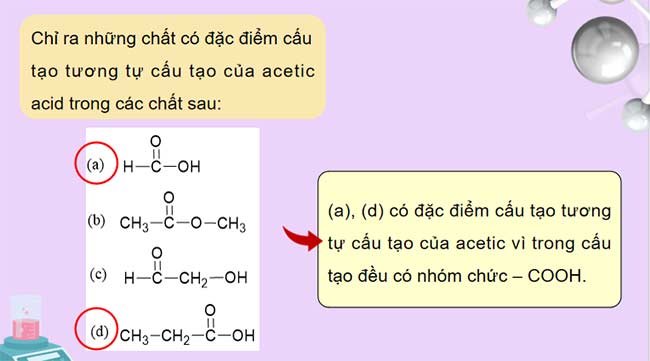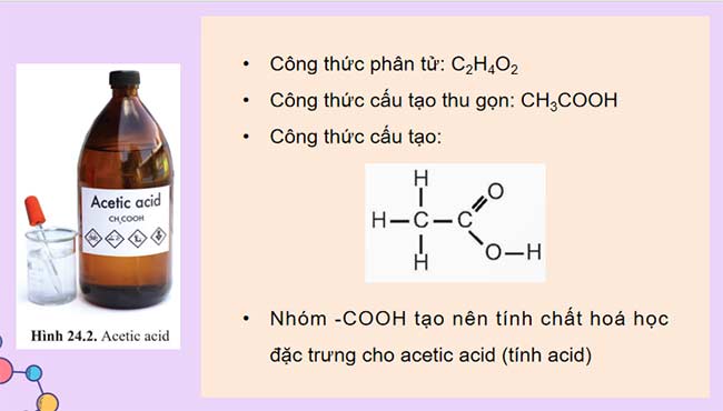 – Quan sát mô hình hoặc hình vẽ, viết được công thức phân tử, công thức cấu tạo; nêu được đặc điểm cấu tạo của acid acetic.
