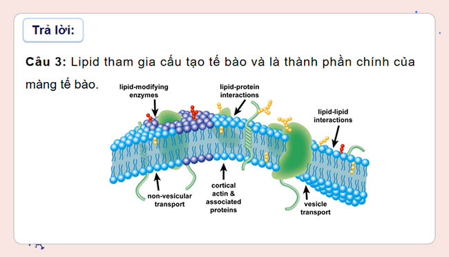 - Nêu được vai trò của lipid tham gia vào cấu tạo tế bào và tích lũy năng lượng trong cơ thể.