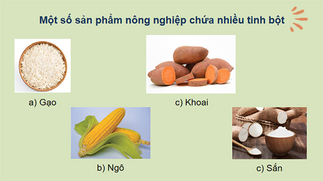 - Nhận biết được các loại lương thực, thực phẩm giàu tinh bột và biết cách sử dụng hợp lí tinh bột.