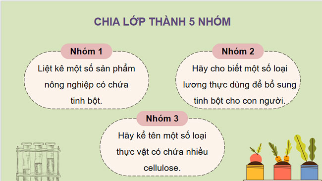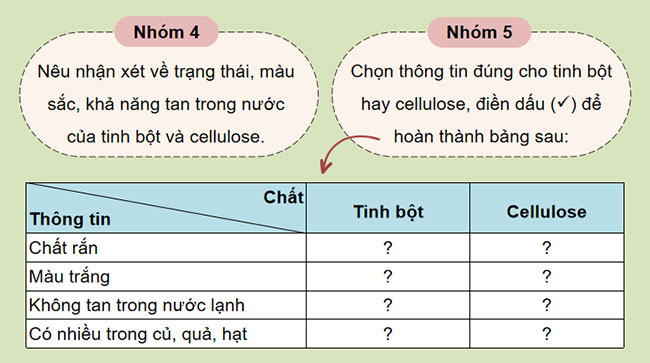 - Năng lực giao tiếp và hợp tác: Sử dụng ngôn ngữ khoa học để tìm hiểu về tinh bột và cellulose; Hoạt động nhóm một cách hiệu quả theo đúng yêu cầu của GV, đảm bảo các thành viên trong nhóm đều được tham gia và trình bày báo cáo.