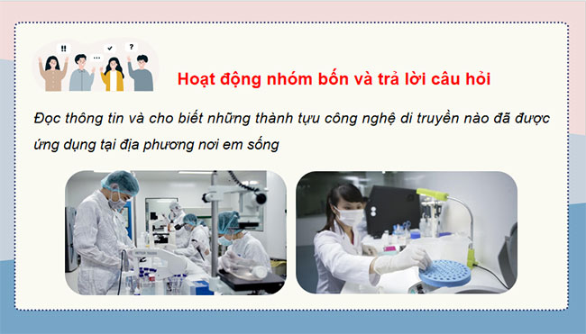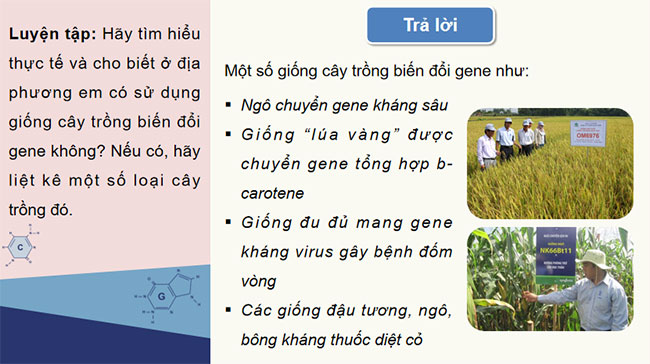 + Sử dụng ngôn ngữ khoa học để diễn đạt về ứng dụng công nghệ di truyền trong một số lĩnh vực của đời sống, một số vấn đề về đạo đức sinh học trong nghiên cứu và ứng dụng công nghệ di truyền, sản phẩm ứng dụng công nghệ di truyền tại địa phương.